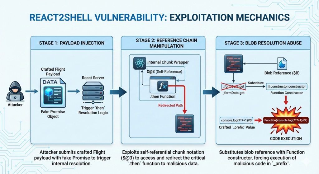 The exploit leverages prototype chain walking through React’s requireModule function, which resolves module exports without implementing proper hasOwnProperty validation. Attackers craft malicious Flight payloads that inject fake Promise objects, hijack internal resolution mechanisms, and ultimately invoke the Function() constructor with attacker-controlled code.
