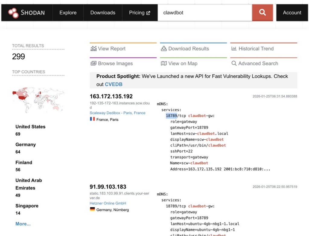 Discovery: Shodan searches for “Clawdbot Control” return hundreds of results within seconds.