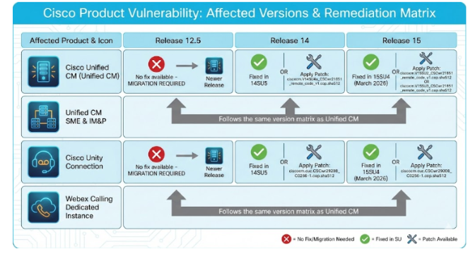 - Release 15: Fixed in 15SU4 (March 2026) or apply patch ciscocm.V15SU2_CSCwr21851_remote_code_v1.cop.sha512 or ciscocm.V15SU3_CSCwr21851_remote_code_v1.cop.sha512
