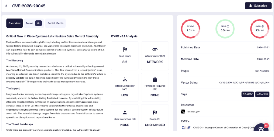Cisco has disclosed CVE-2026-20045, a critical remote code execution vulnerability affecting multiple Unified Communications products. The flaw has been confirmed as actively exploited in the wild, prompting emergency patches and a swift response from the U.S. Cybersecurity and Infrastructure Security Agency (CISA), which added the vulnerability to its Known Exploited Vulnerabilities catalog on January 21, 2026.