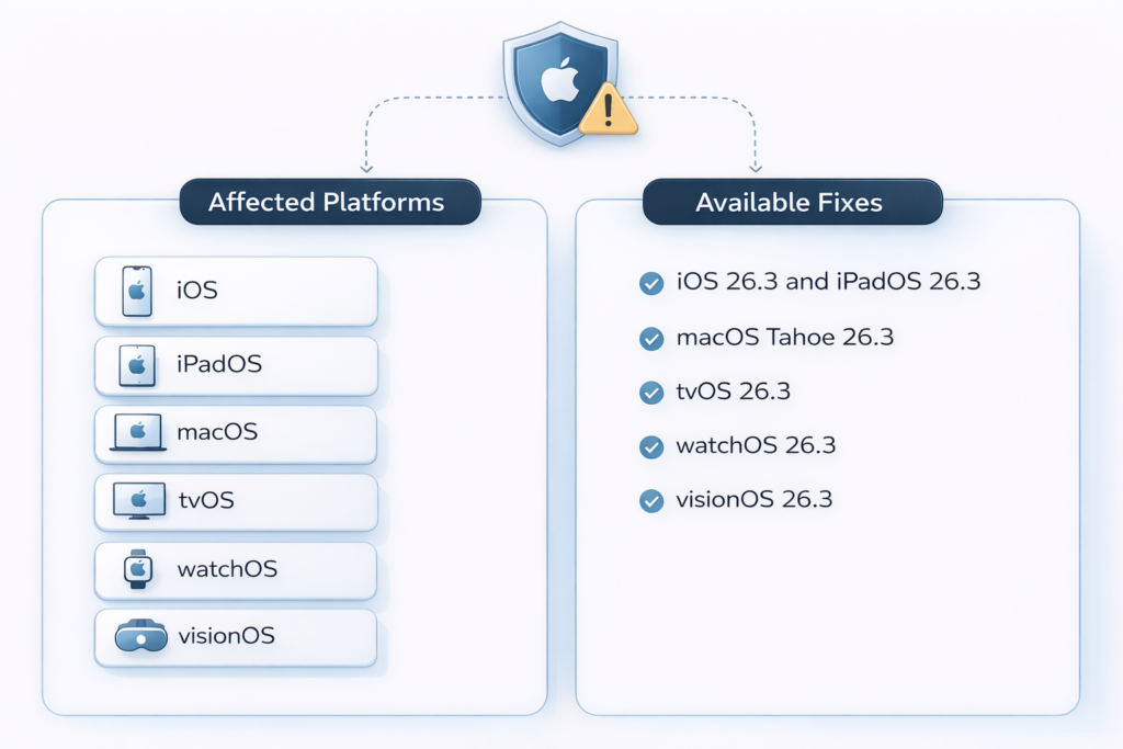 The vulnerability affects iOS, iPadOS, macOS, tvOS, watchOS, and visionOS. Apple has released patches across its current OS branches: