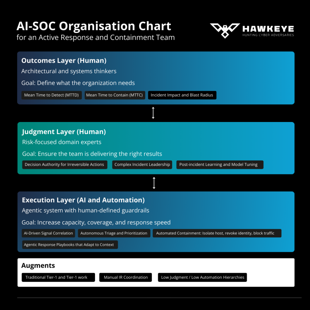 Outcomes Layer (Human): Architectural and systems thinkers who define what the organisation needs. Their responsibility is setting the metrics that matter: MTTD, MTTC, and Incident Impact and Blast Radius. These are business outcomes, not technical outputs.